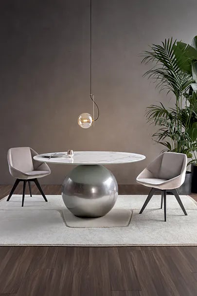 Circus - это круглый стол фиксированного дизайна, который основан на законах физики благодаря контрасту совершенно разных геометрических форм: впечатляющее и эффектное центральное основание увенчано большой дискообразной столешницей, вызывающей приятное ощущение движения. Стол приобретает прочность и элегантность в уникальном балансирующем действии, становясь настоящей звездой гостиной. Столешница доступна из массива дерева, керамики или мрамора, и она идеально адаптируется к стилю дома, гармонично вписываясь в окружающую среду, не теряя, однако, своей уникальности. Металлическая основа доступна в различных вариантах исполнения, включая элегантную бронзу, свинец, перламутровое золото, а также полированный, матовый хром, темный никель и коричневую никелевую отделку.