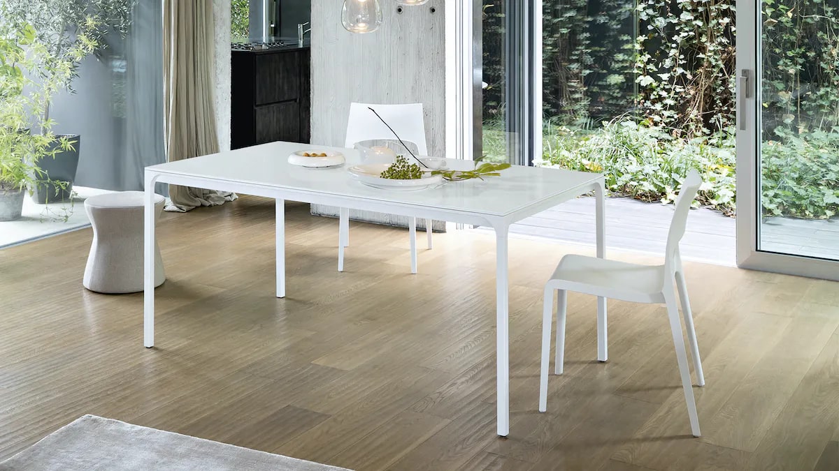 Стол Zen, созданный в результате сотрудничества Bonaldo и студии Marconato & Zappa, представляет собой стол с минималистичным дизайном, но при этом обладает мощным воздействием. Это простой стол с четкими формами и современными линиями, которые идеально подходят для любого типа обстановки, от самой традиционной до самой современной. Тонкие, изящные и устойчивые формы и возможность удлинения столешницы делают этот стол подходящим как для кухни, так и для офиса. Главным элементом является практичность: начиная от названия “Zen” и заканчивая выбором материалов: окрашенный металл для основания и стекло или лакированное дерево для столешницы. Удлинители из лакированного дерева позволяют расширить поверхность, создавая удобное дополнительное пространство; благодаря боковому перемещению ножки располагаются на краю столешницы и не мешают сидению.