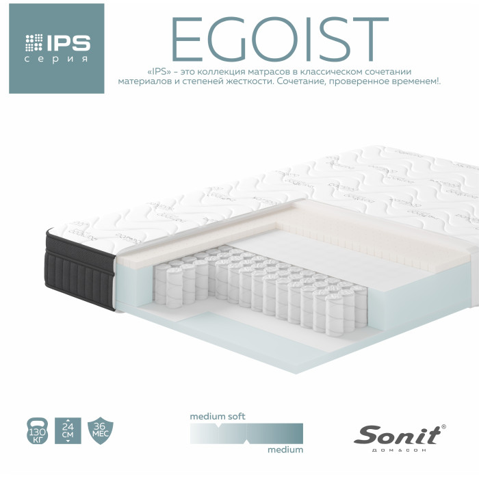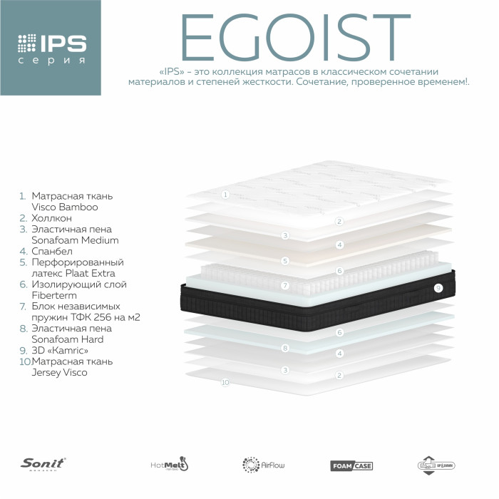 Матрас EGOIST имеет две стороны жесткости. С одной стороны-среднемягкая, с другой средняя степень жесткости. В качестве наполнителя служит перфорированный латекс "PLAAT EXTRA", производитель "Latexco "(Бельгия).Имеет перфорацию по всей поверхности, для обеспечения циркуляции воздуха внутри матраса, подстраивается под изгибы тела, тем самым оказывает правильную поддержку во время сна. Объёмный чехол из трикотажной ткани, стеганный на основе эластичной пены "SonaFoam" и холлкона дает высокий анатомический эффект.