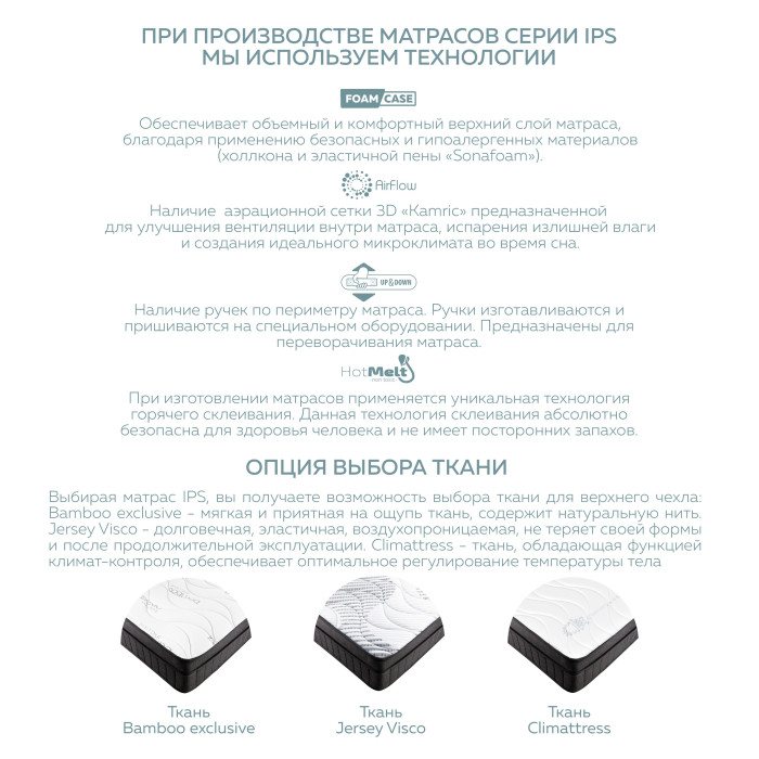 Для склеивания слоев матраса используется уникальная технология горячего склеивания, которая абсолютно безопасна для здоровья человека и не имеет посторонних запахов, в составе нет растворителей. Надежно скрепляет слои матраса, не рассыхается со временем.
