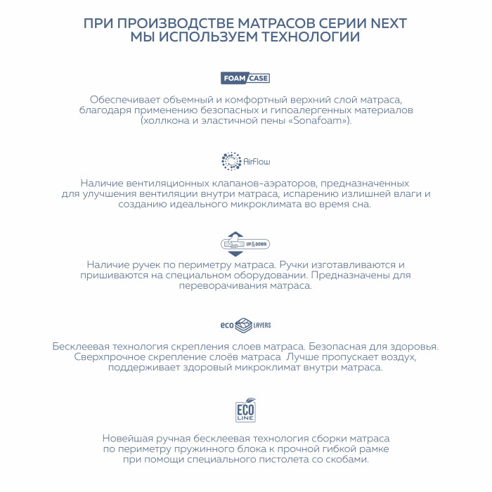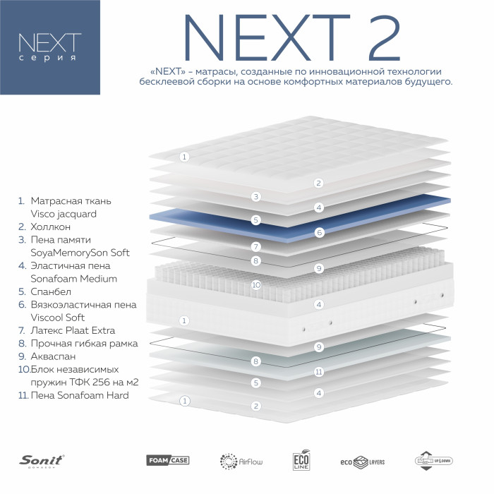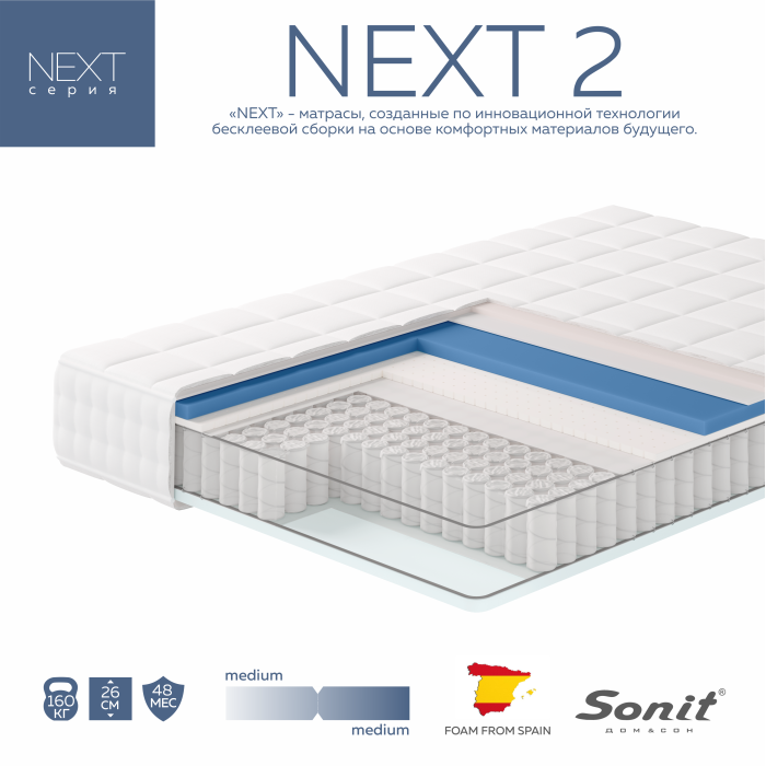 «NEXT» - матрасы, созданные по инновационной технологии бесклеевой сборки на основе комфортных материалов будущего. В основе коллекции лежат эксклюзивные наполнители, большая часть которых является уникальной новинкой на рынке Беларуси, а бесклеевая сборка и вовсе почти нигде более не применяется. Данная коллекция обладает рядом преимуществ и особых характеристик, позволяющих считать ее уникальной и достойной внимания особенно требовательных покупателей.