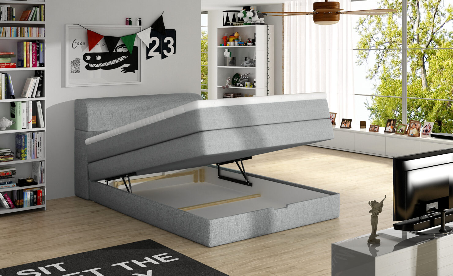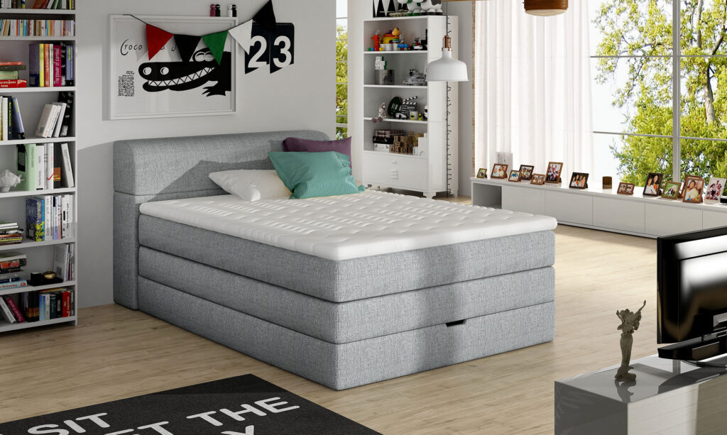 Это простая и классическая кровать, которая идеально подойдет для комнаты подростка. Его самое большое преимущество — 2 скрытых контейнера. Один из них спрятан под матрасами, а второй одновременно служит подголовником. Это делает эту модель особенно подходящей для небольших помещений, где найти дополнительное место для хранения становится проблемой.