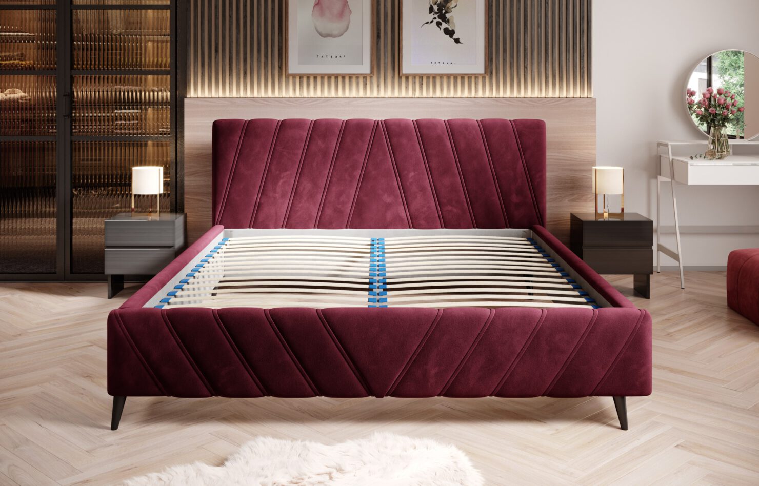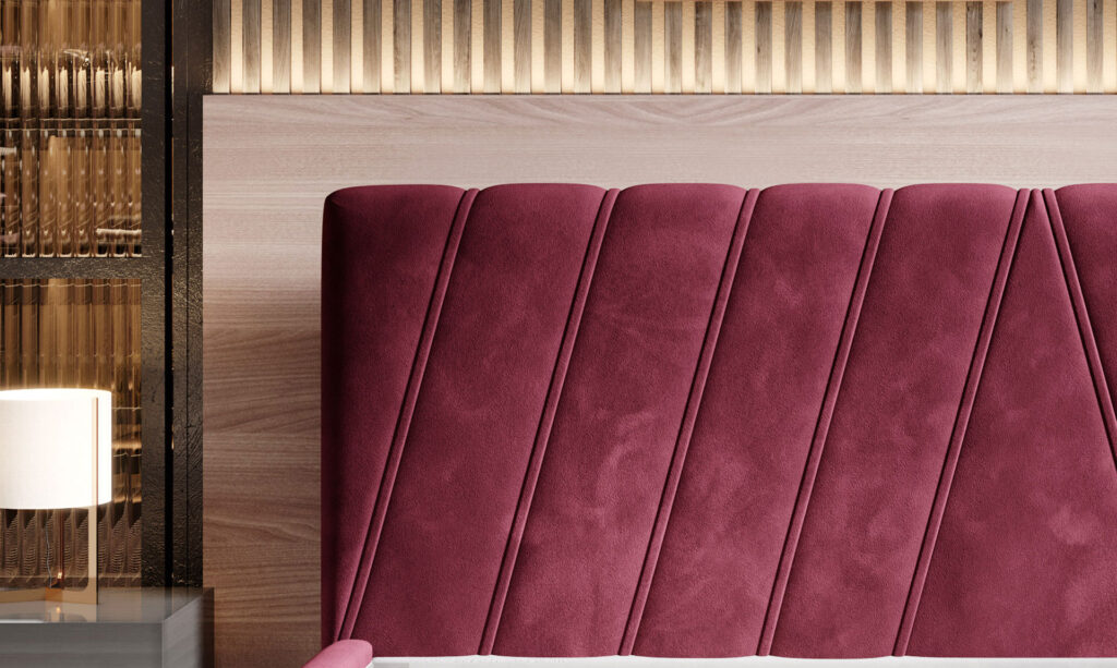 Эта модель отличается интересной строчкой, идущей с обеих сторон подголовника и соединяющейся в его центральной точке. Высокие, стройные ножки придают конструкции легкость. Кровать доступна в двух вариантах – оснащенная системой ручной регулировки высоты, позволяющей настроить матрас под индивидуальные нужды пользователя, и в версии с контейнером, позволяющей хранить постельные принадлежности.