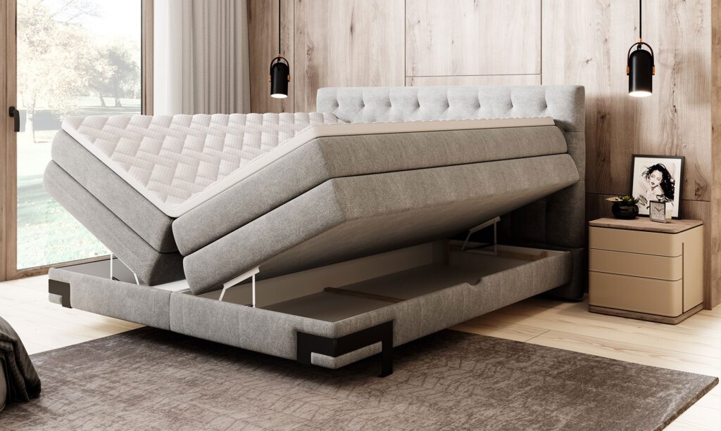 Эту модель отличает многочисленная стежка на изголовье. Дополнительно характерным элементом кровати являются ножки, которые создают интересный визуальный эффект. 2 скрытых контейнера для постельного белья позволят хранить подушки и одеяла, а качественные матрасы гарантируют комфорт и удобство.