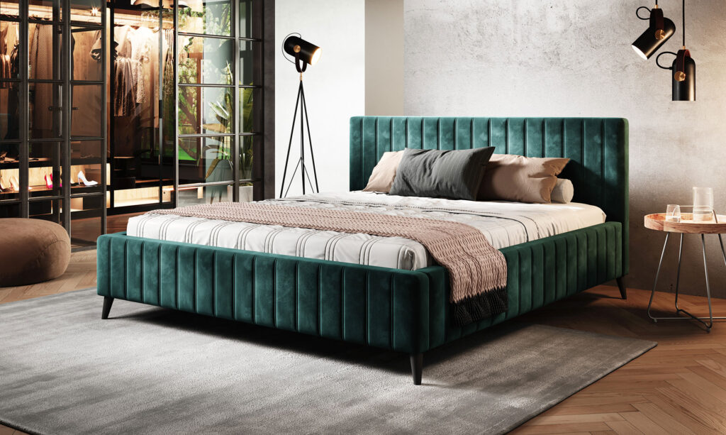 Это кровать, которая найдет множество сторонников. Многочисленные вертикальные строчки, как на изголовье, подлокотнике, так и по бокам, делают эту модель универсальной и впишущейся в любой интерьер. Кровать доступна в двух вариантах – оснащенная системой ручной регулировки высоты, позволяющей настроить матрас под индивидуальные нужды пользователя, и в версии с контейнером, позволяющей хранить постельные принадлежности.
